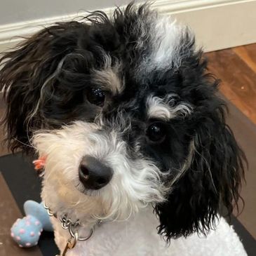 Nala is our wonderful F1 Mini Tri-Color Bernedoodle from our own Rosie and Gus. Her gorgeous tri-color will produce beautiful tri-color minis when paired with our tri-color Poodles. Nala has a very laid-back temperament and is a joy to have around the house. She gets along well with everyone.