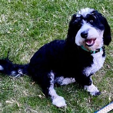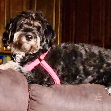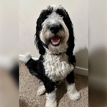 Bella is our newest F1 Standard Berndoodle Dog. We've raised her from a puppy. She is a wonderful dog that is as sweet as she is beautiful. We could not be happier with her calm and loving demeanor towards both people and animals.