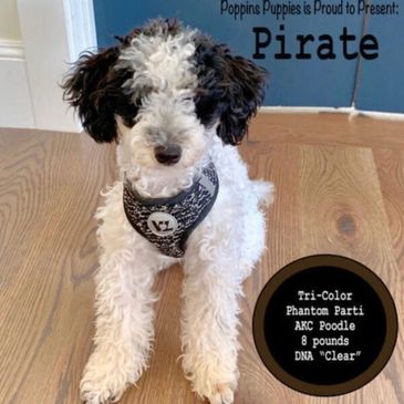 Pirate is a 9-pound Tri-Color Parti Phantom Miniature AKC Poodle. We believe he will create beautiful tri-color Bernedoodles.